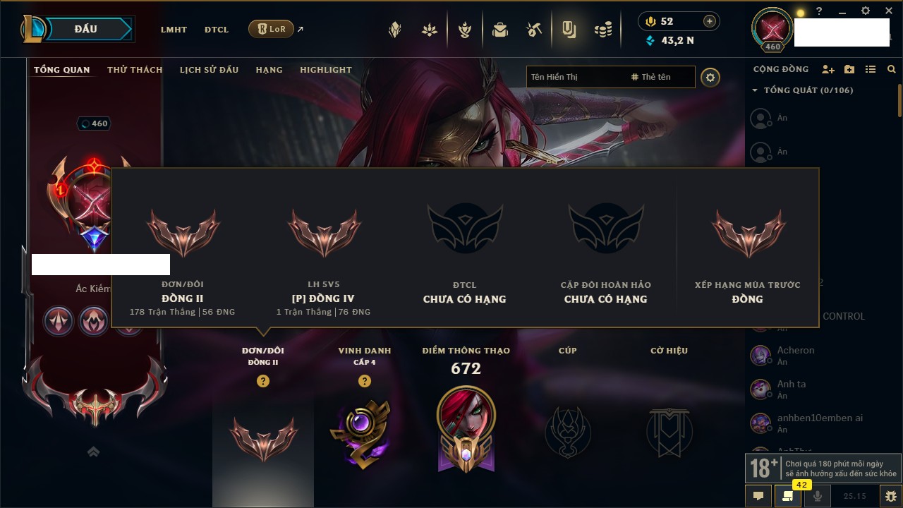 Rank Đơn: Đồng IVKhung: ĐồngTướng: 172 - Còn 66370 THXTrang Phục: 49Rank ĐTCL: Bạch Kim ILinh Thú: 243
