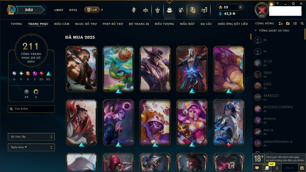 Rank Đơn: Bạc IIKhung: Bạch kimTướng: 169 - Còn 81813 THXTrang Phục: 301Rank ĐTCL: Chưa RankLinh Thú: 140