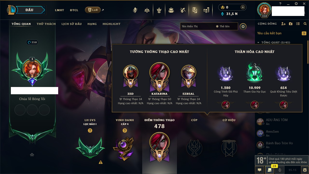 Rank Đơn: Chưa rank mùa nào Khung: Chưa có khung Tướng: 3 - Còn 3800 THX Trang Phục: 0 Rank ĐTCL: Chưa Rank Linh Thú: 31