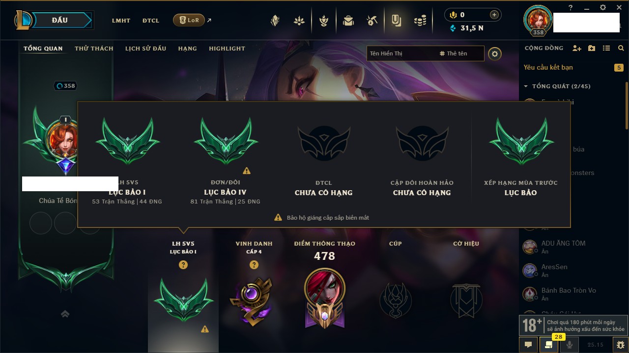 Rank Đơn: Bạc III Khung: Bạc Tướng: 170 - Còn 30078 THX Trang Phục: 225 Rank ĐTCL: Chưa Rank Linh Thú: 138