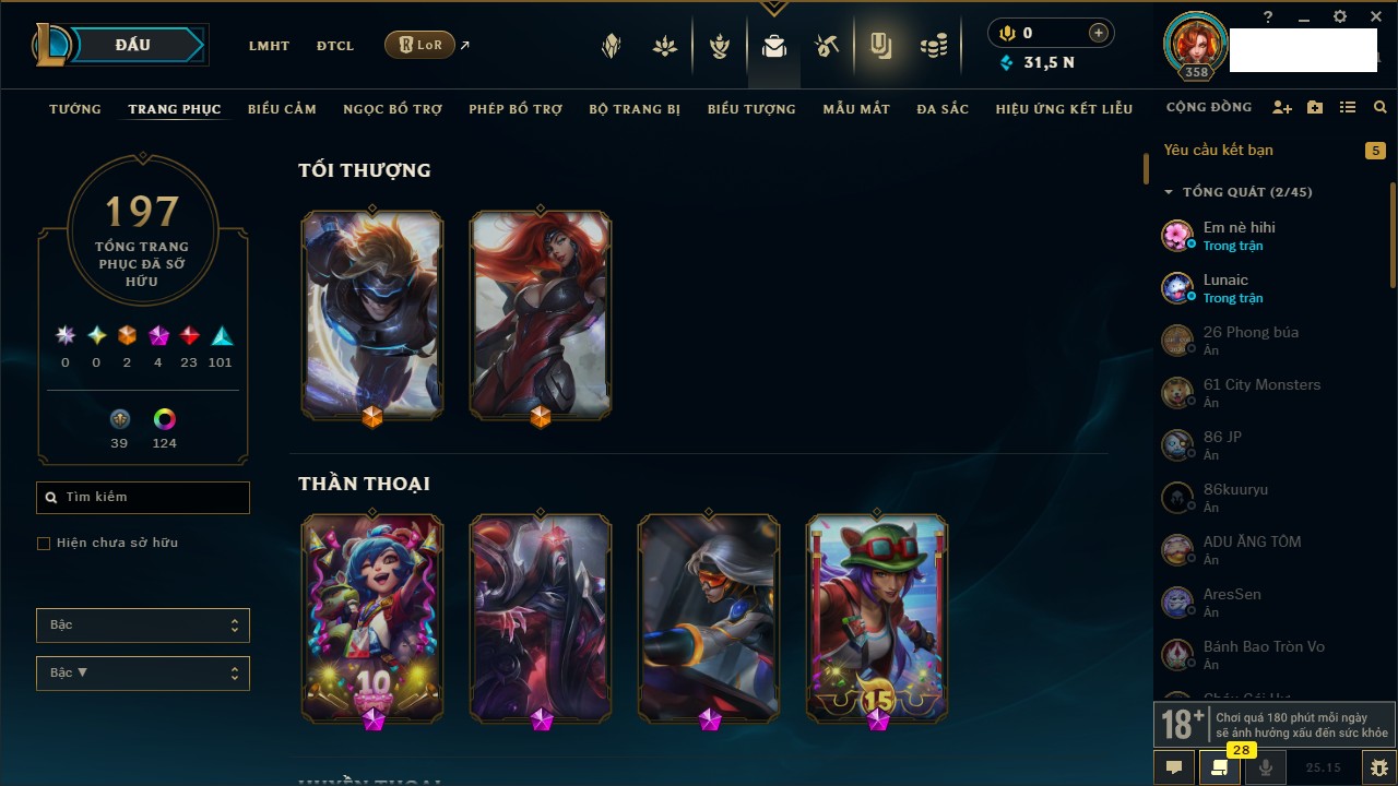 Rank Đơn: Vàng III Khung: Vàng Tướng: 171 - Còn 91047 THX Trang Phục: 98 Rank ĐTCL: Bạch Kim IV Linh Thú: 281