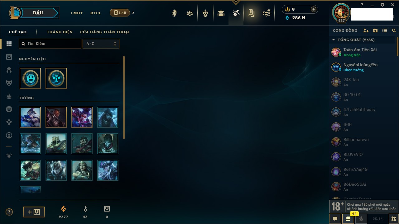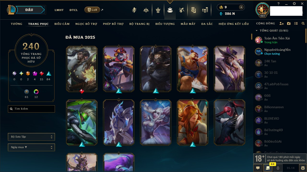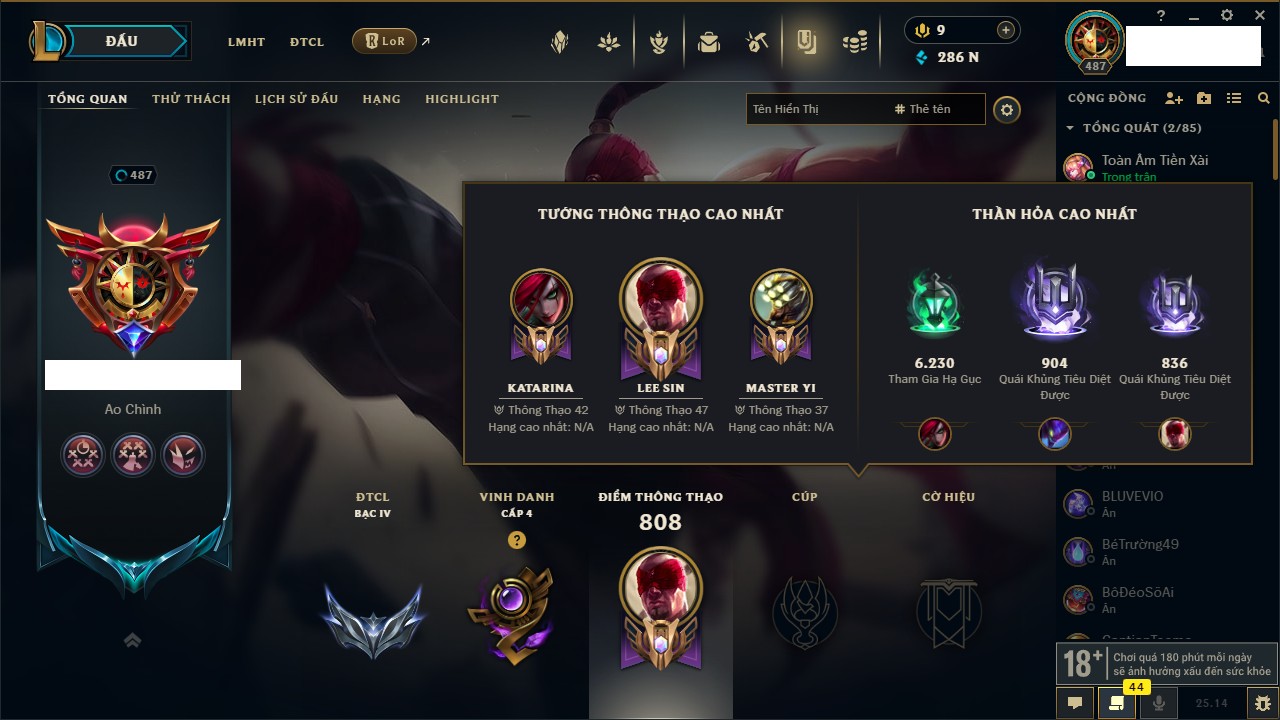 Rank Đơn: Chưa RankKhung: Chưa có khungTướng: 171 - Còn 827961 THXTrang Phục: 193Rank ĐTCL: Chưa RankLinh Thú: 63