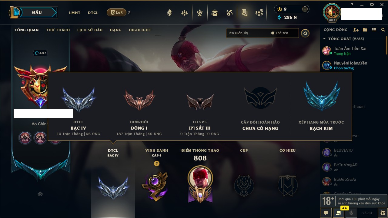Rank Đơn: Chưa RankKhung: VàngTướng: 171 - Còn 660284 THXTrang Phục: 199Rank ĐTCL: Chưa RankLinh Thú: 34
