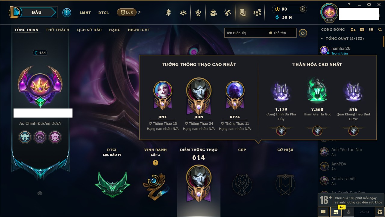 Rank Đơn: Bạc III Khung: Bạc Tướng: 170 - Còn 30078 THX Trang Phục: 225 Rank ĐTCL: Chưa Rank Linh Thú: 138