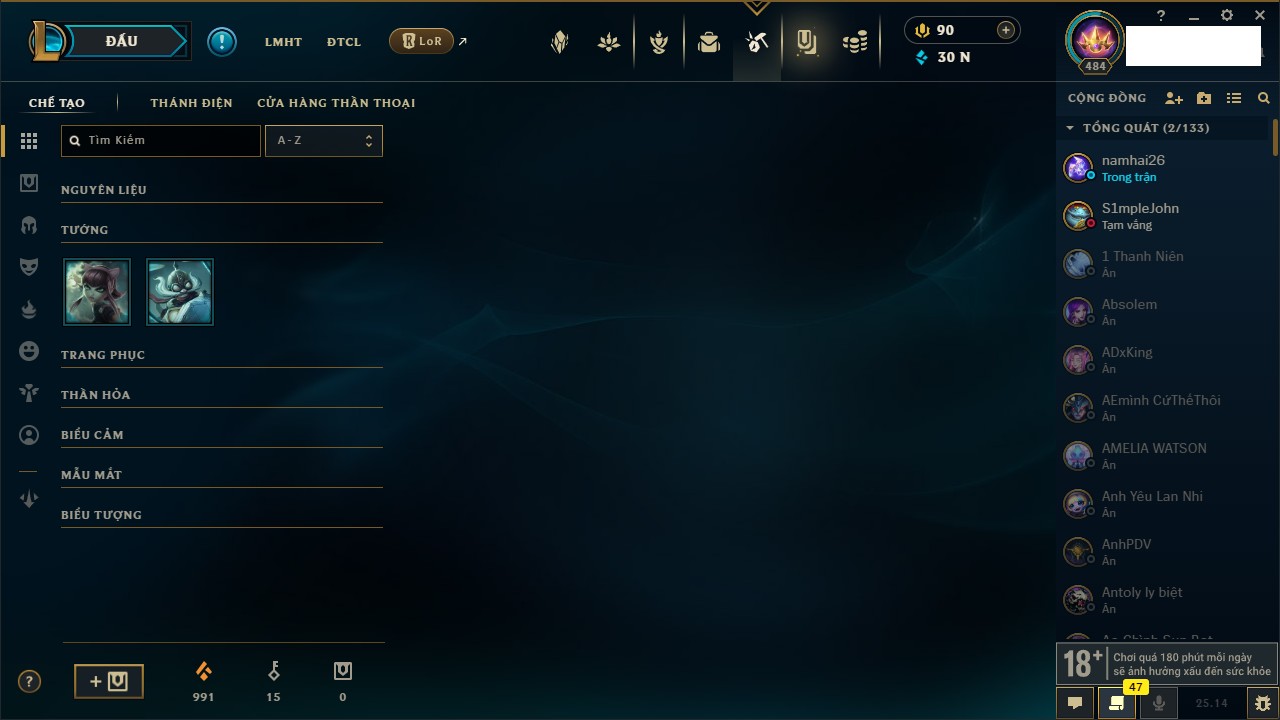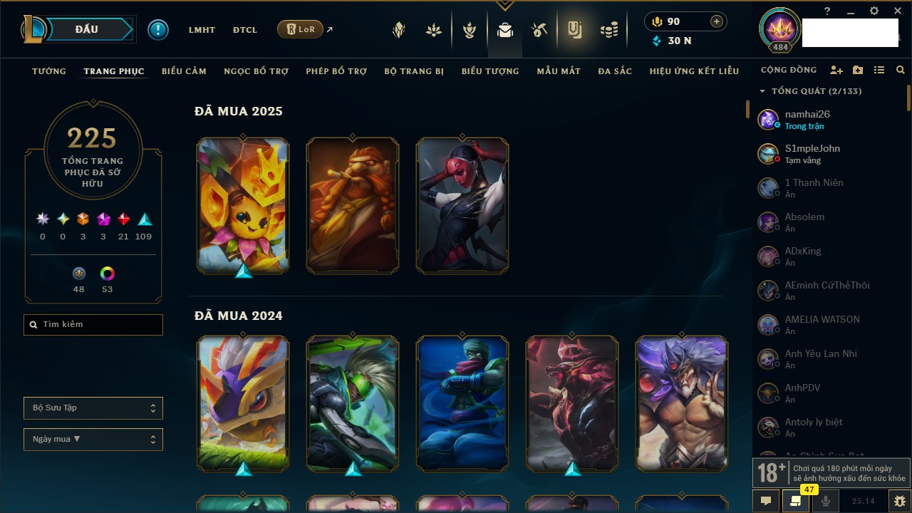 Rank Đơn: Vàng III Khung: Vàng Tướng: 171 - Còn 91047 THX Trang Phục: 98 Rank ĐTCL: Bạch Kim IV Linh Thú: 281
