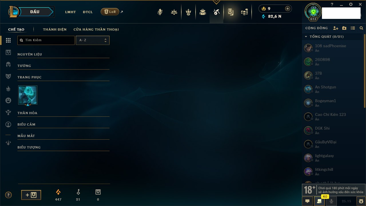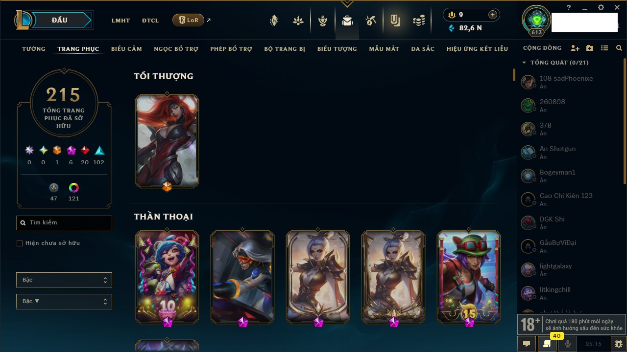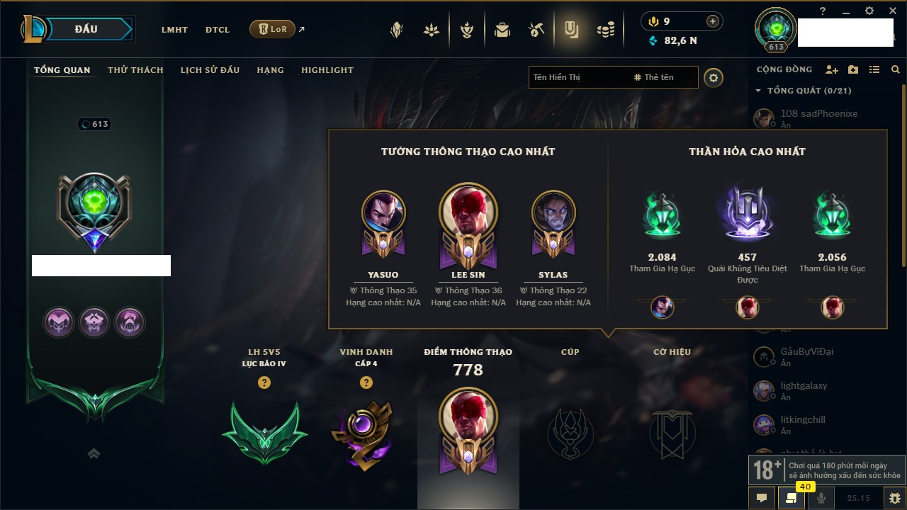 Rank Đơn: Bạch Kim IIKhung: Bạch kimTướng: 171 - Còn 316137 THXTrang Phục: 89Rank ĐTCL: Bạch Kim IIILinh Thú: 94