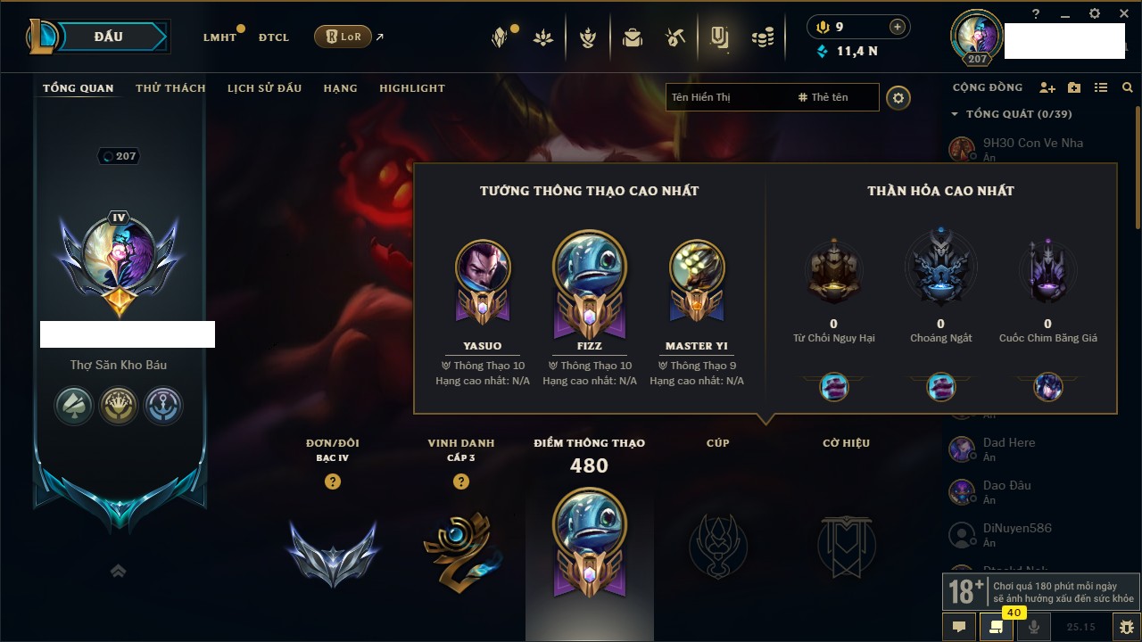 Rank Đơn: Bạch Kim IIKhung: Bạch kimTướng: 171 - Còn 316137 THXTrang Phục: 89Rank ĐTCL: Bạch Kim IIILinh Thú: 94