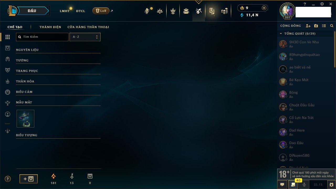 Rank Đơn: Lục Bảo IVKhung: VàngTướng: 171 - Còn 154648 THXTrang Phục: 203Rank ĐTCL: Bạch Kim IVLinh Thú: 69