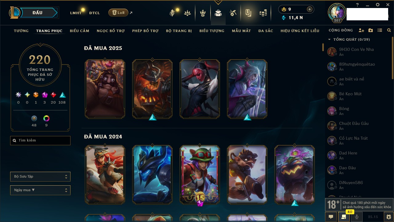 Rank Đơn: Vàng IIKhung: VàngTướng: 170 - Còn 243330 THXTrang Phục: 230Rank ĐTCL: Chưa RankLinh Thú: 68