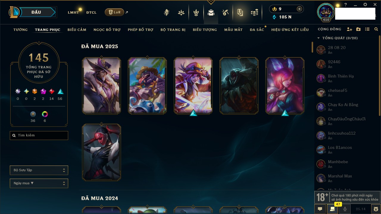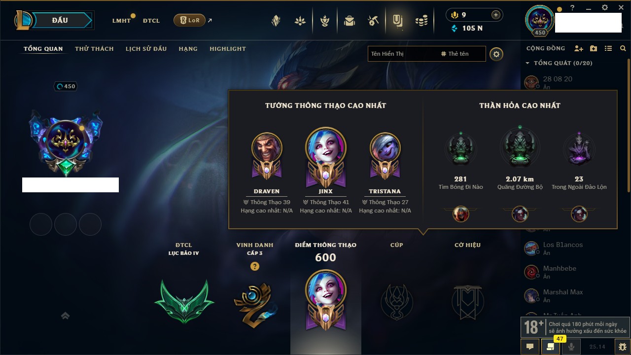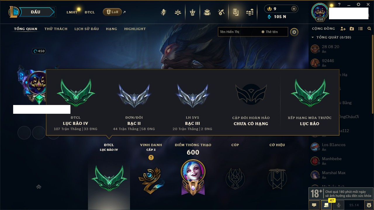 Rank Đơn: Bạc IIIKhung: BạcTướng: 168 - Còn 101710 THXTrang Phục: 184Rank ĐTCL: Chưa RankLinh Thú: 17