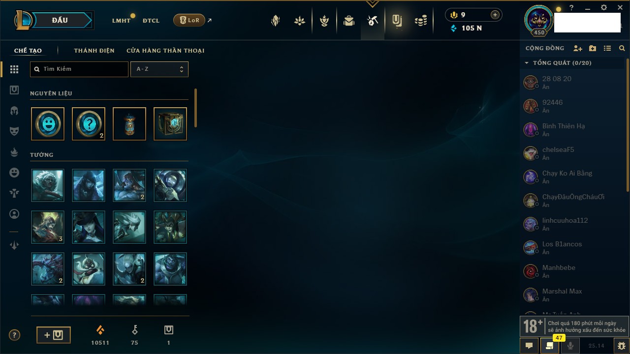 Rank Đơn: Bạc IVKhung: BạcTướng: 171 - Còn 102637 THXTrang Phục: 169Rank ĐTCL: Vàng IILinh Thú: 127