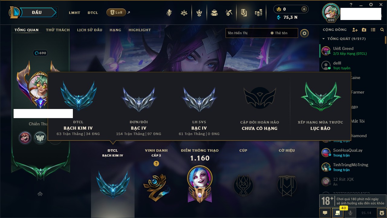 Rank Đơn: Vàng IKhung: Bạch kimTướng: 170 - Còn 212450 THXTrang Phục: 214Rank ĐTCL: Bạch Kim IVLinh Thú: 221