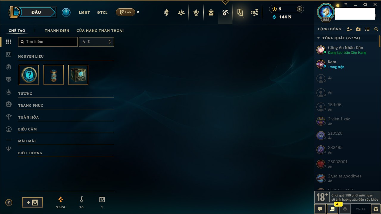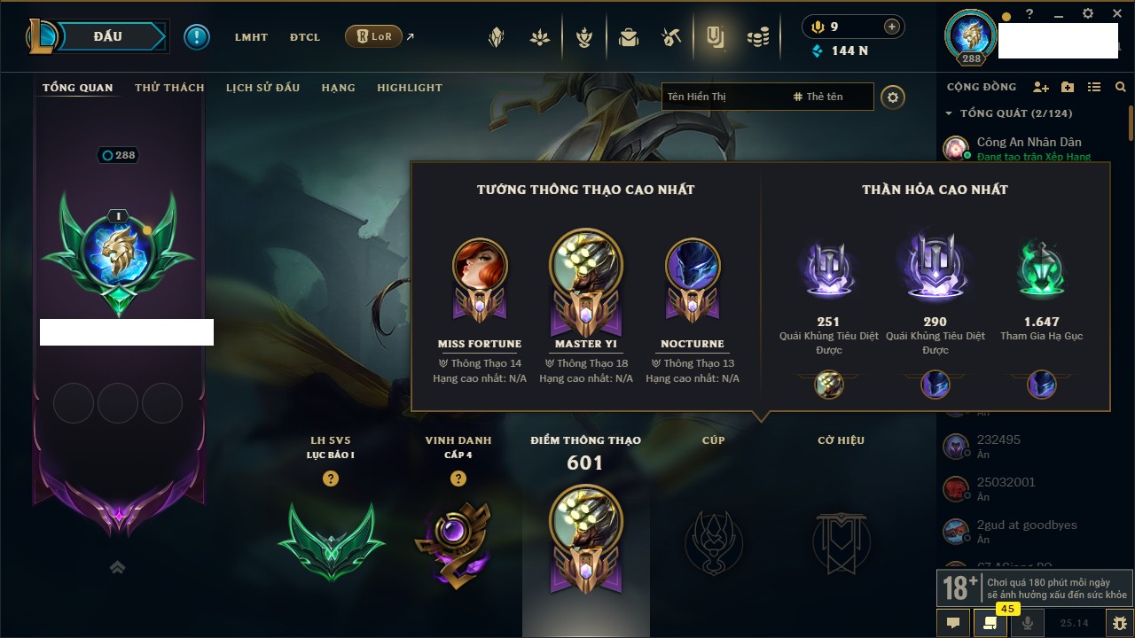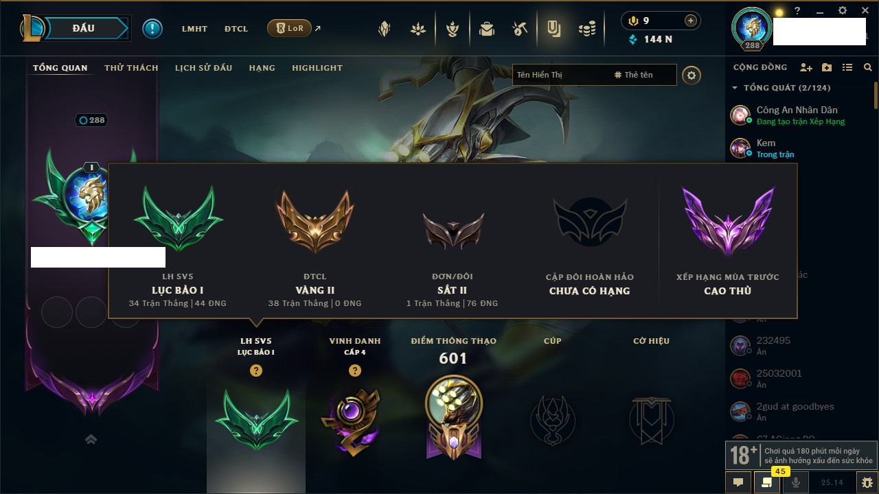 Rank Đơn: Bạc IIIKhung: Chưa có khungTướng: 171 - Còn 21493 THXTrang Phục: 252Rank ĐTCL: Bạch Kim IVLinh Thú: 123