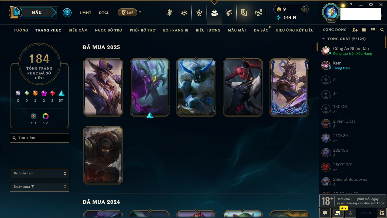Rank Đơn: Vàng IIIKhung: VàngTướng: 171 - Còn 159339 THXTrang Phục: 218Rank ĐTCL: Lục Bảo IIILinh Thú: 151