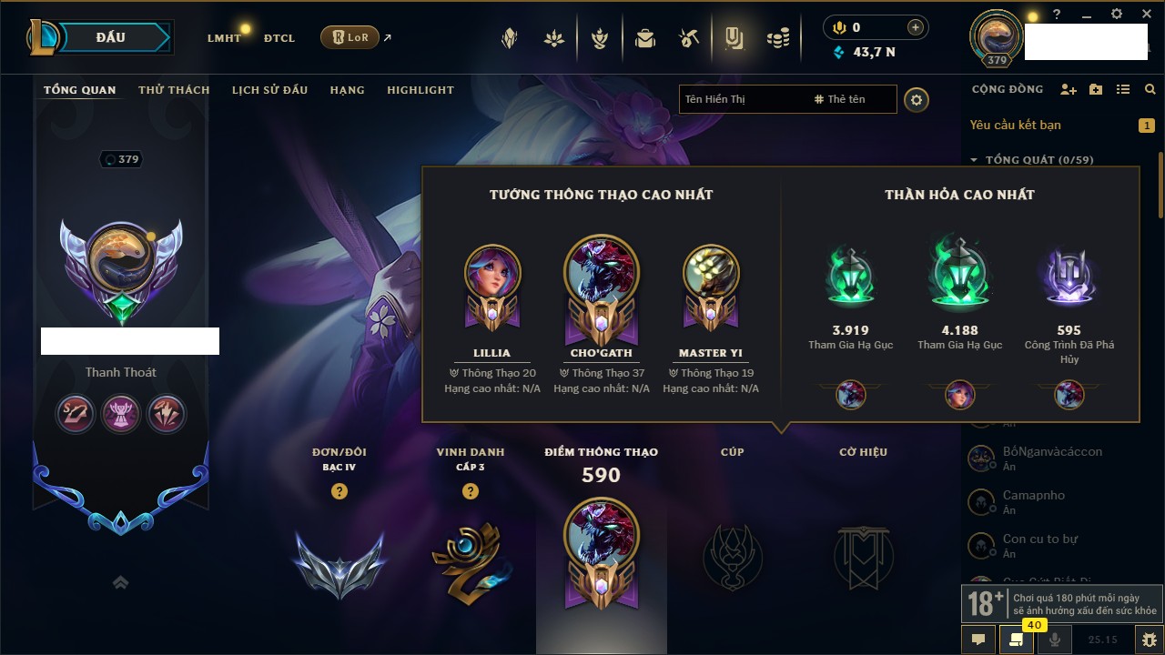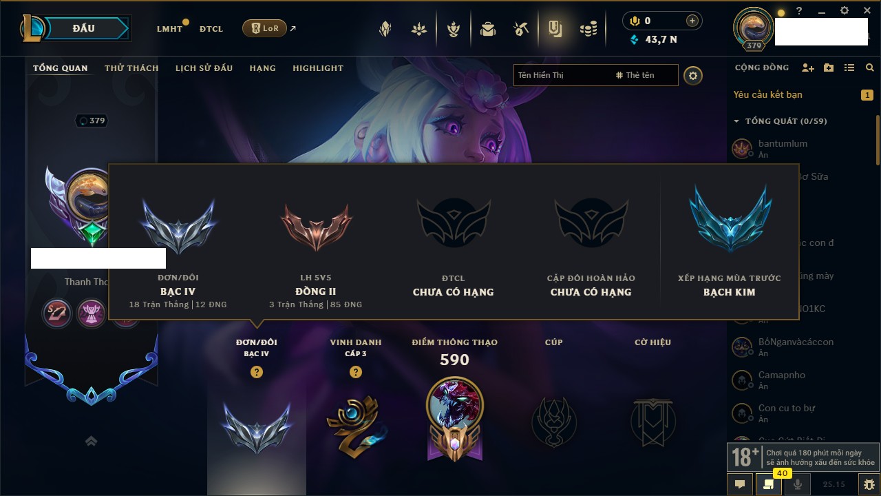 Rank Đơn: Bạc IIIKhung: Chưa có khungTướng: 163 - Còn 66843 THXTrang Phục: 182Rank ĐTCL: Kim Cương IVLinh Thú: 114