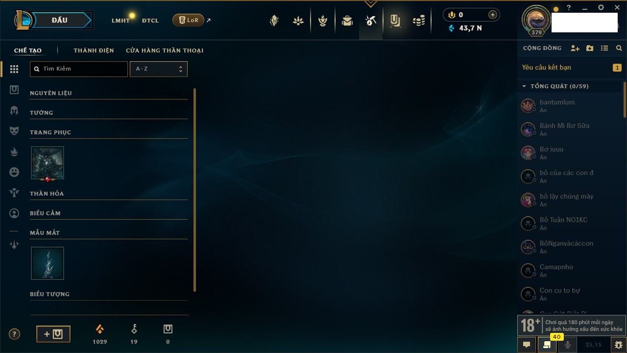 Rank Đơn: Vàng IIIKhung: BạcTướng: 171 - Còn 101359 THXTrang Phục: 88Rank ĐTCL: Kim Cương IVLinh Thú: 200