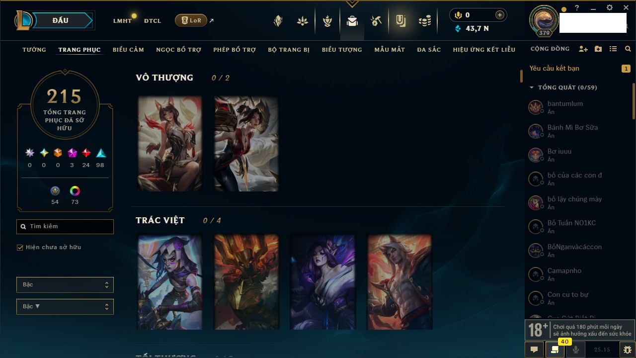 Rank Đơn: Đồng IIKhung: ĐồngTướng: 170 - Còn 66145 THXTrang Phục: 215Rank ĐTCL: Chưa RankLinh Thú: 52