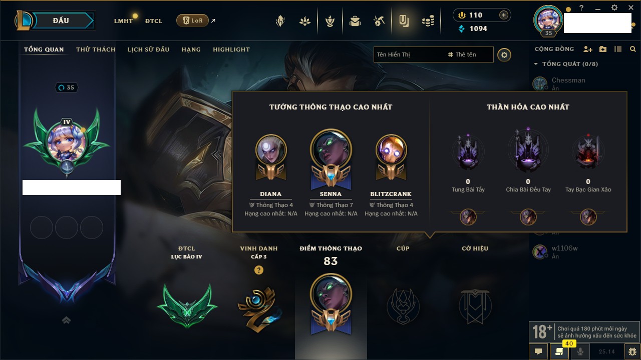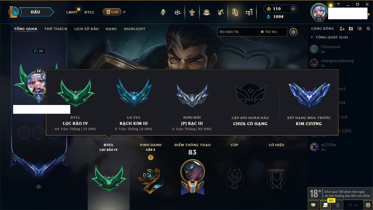 Rank Đơn: Bạc IVKhung: BạcTướng: 171 - Còn 173918 THXTrang Phục: 233Rank ĐTCL: Lục Bảo IIILinh Thú: 26