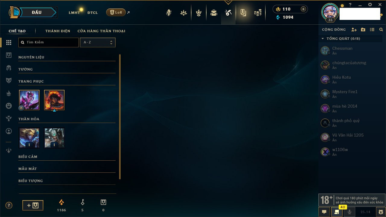Rank Đơn: Vàng IIIKhung: Bạch kimTướng: 171 - Còn 98230 THXTrang Phục: 235Rank ĐTCL: Vàng IVLinh Thú: 59