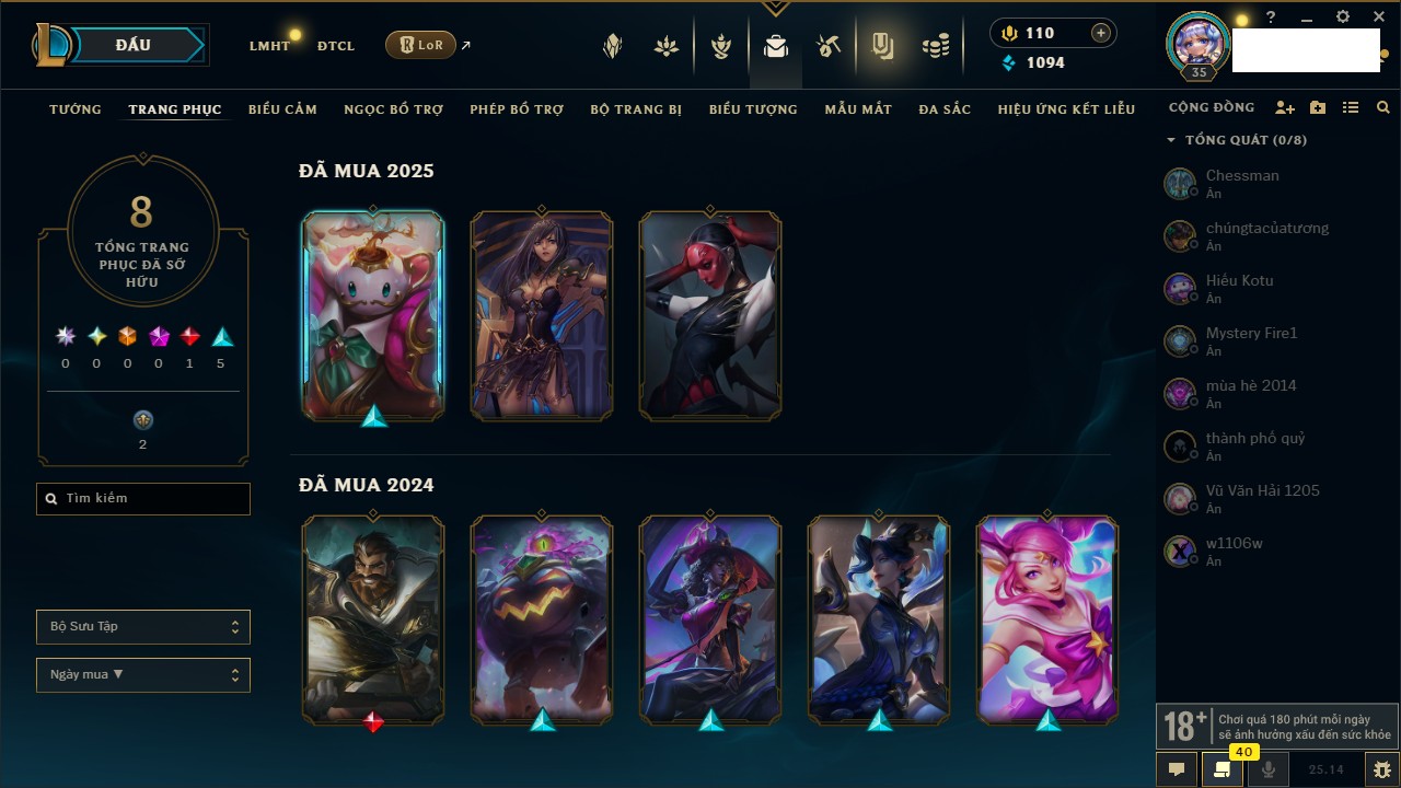 Rank Đơn: Sắt IIIKhung: SắtTướng: 171 - Còn 62070 THXTrang Phục: 198Rank ĐTCL: Bạch Kim IIILinh Thú: 237