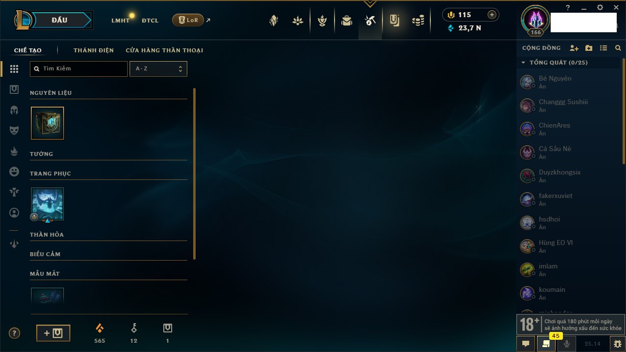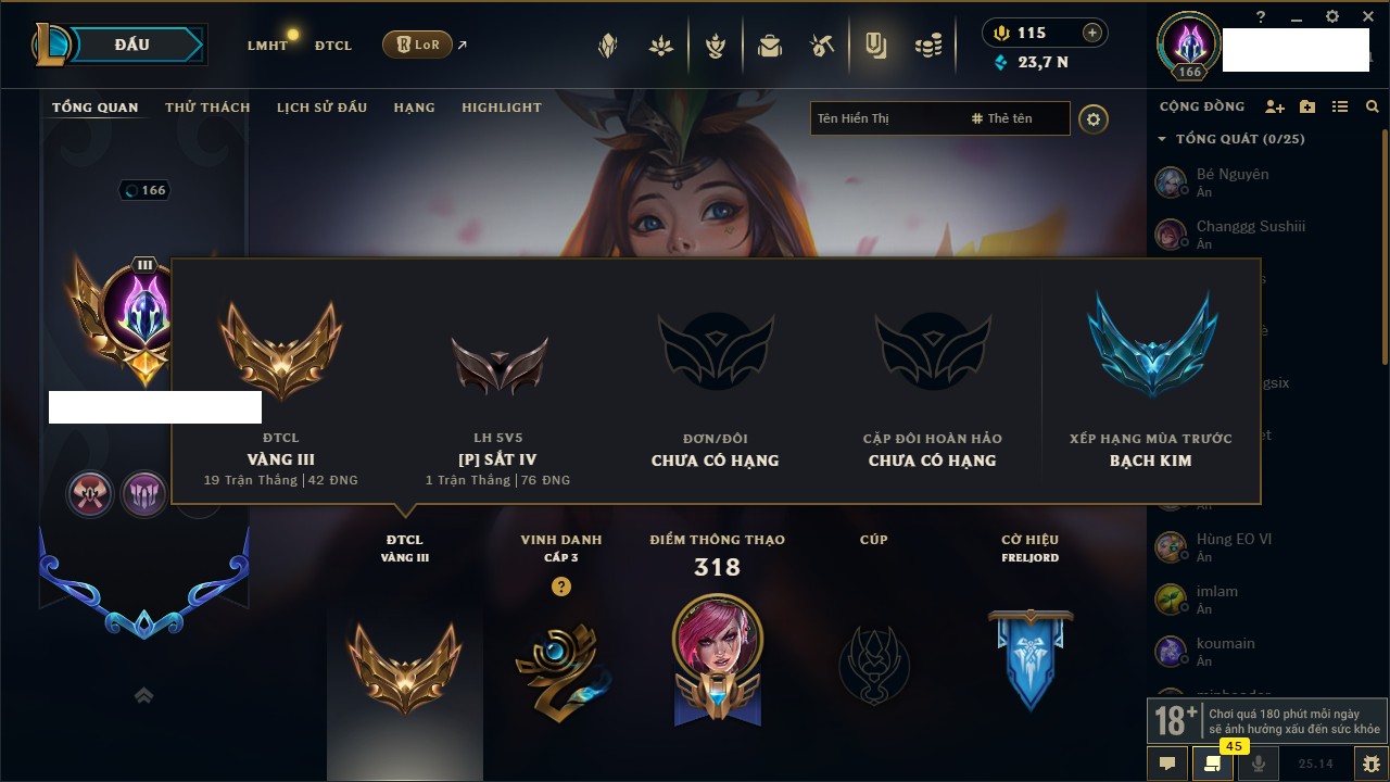 Rank Đơn: Chưa RankKhung: VàngTướng: 171 - Còn 207237 THXTrang Phục: 125Rank ĐTCL: Chưa RankLinh Thú: 112