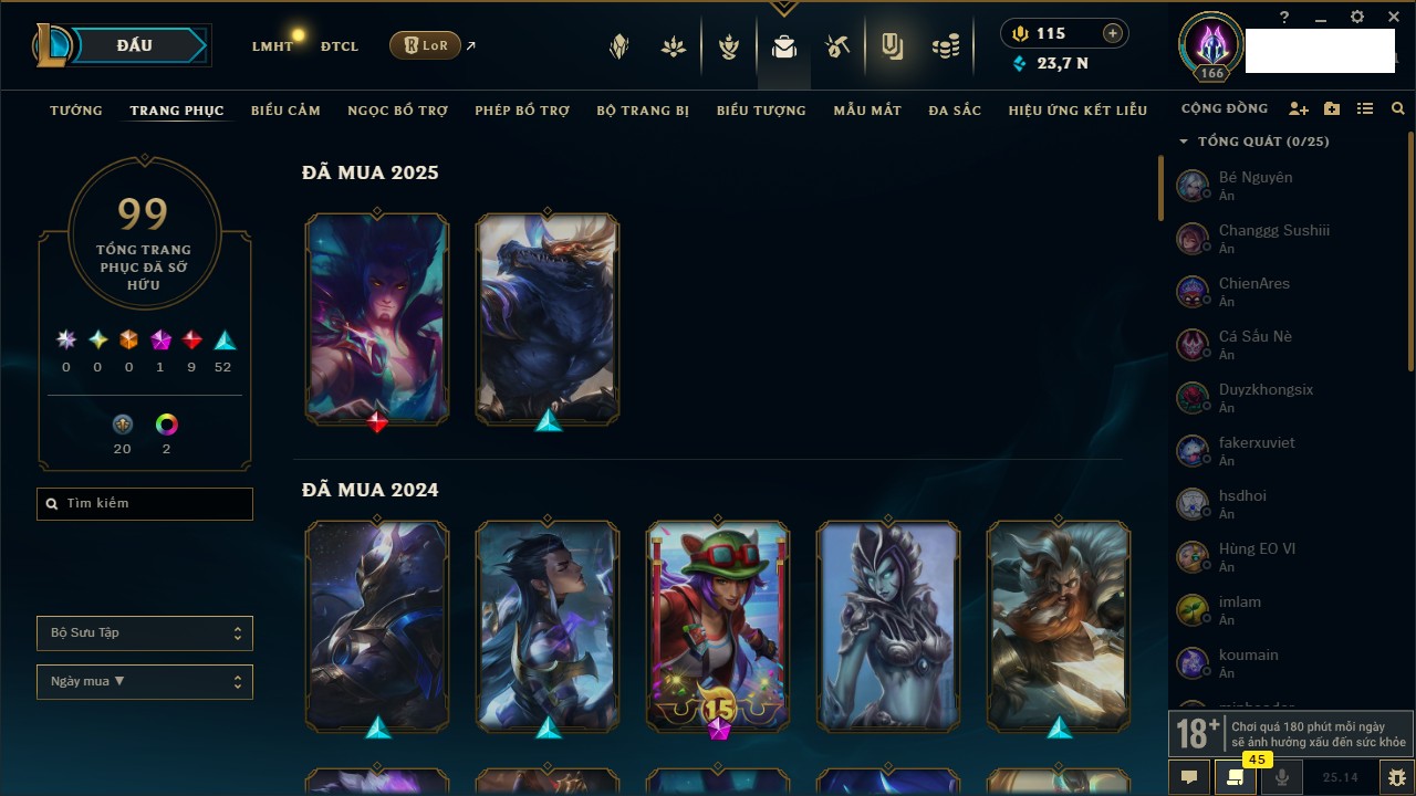 Rank Đơn: Chưa RankKhung: Chưa có khungTướng: 165 - Còn 1609 THXTrang Phục: 25Rank ĐTCL: Chưa RankLinh Thú: 44