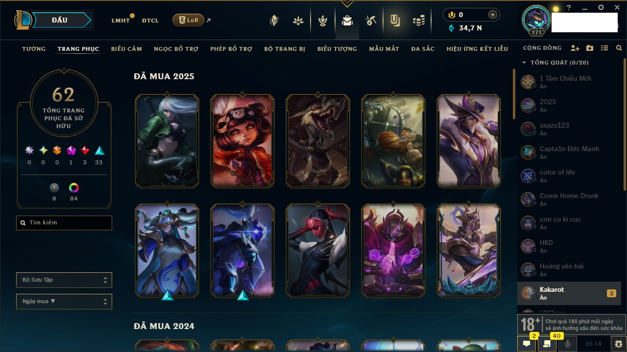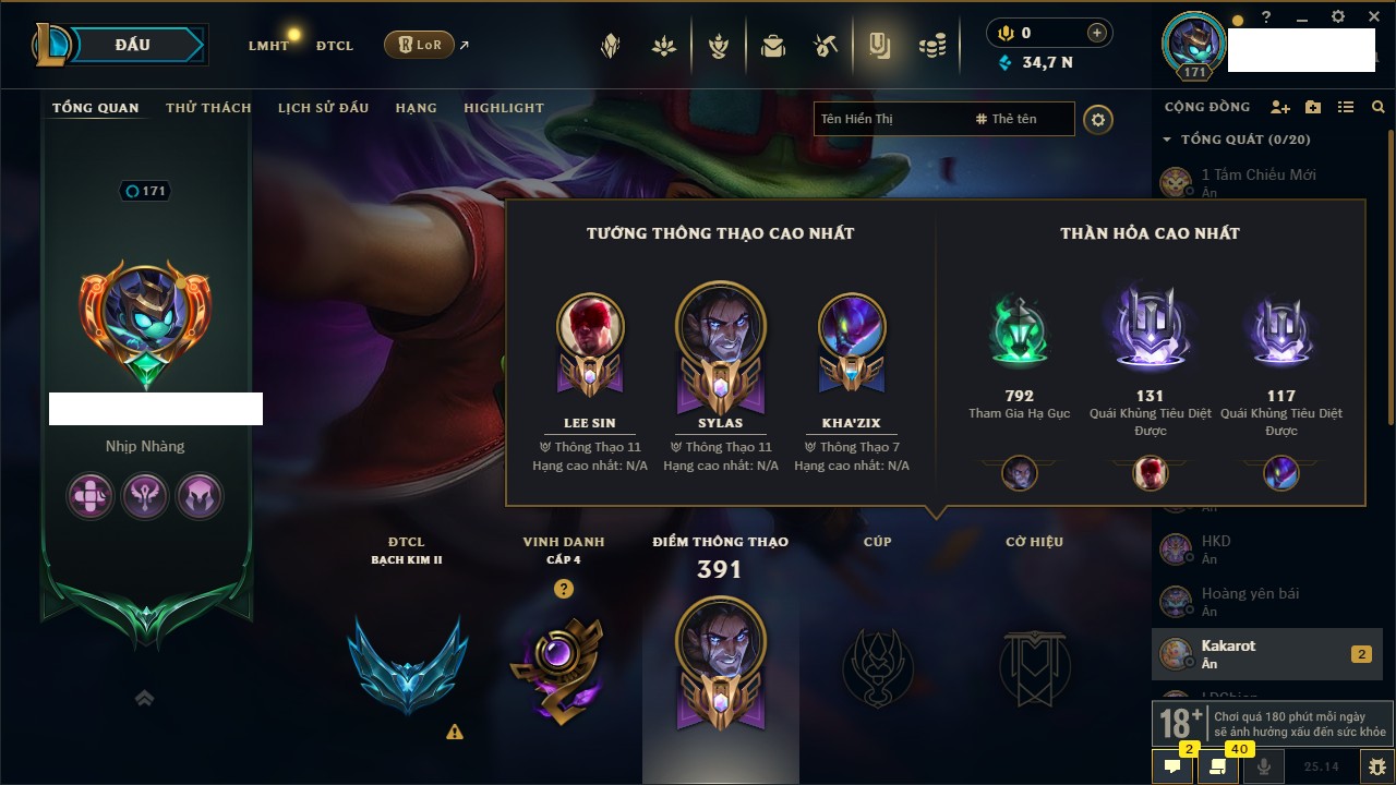 Rank Đơn: Bạch Kim IIIKhung: Bạch kimTướng: 170 - Còn 61079 THXTrang Phục: 352Rank ĐTCL: Sắt IILinh Thú: 70