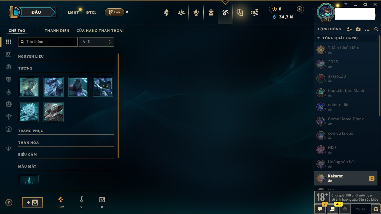 Rank Đơn: Bạch Kim IIKhung: Bạch kimTướng: 171 - Còn 263986 THXTrang Phục: 306Rank ĐTCL: Lục Bảo IVLinh Thú: 96