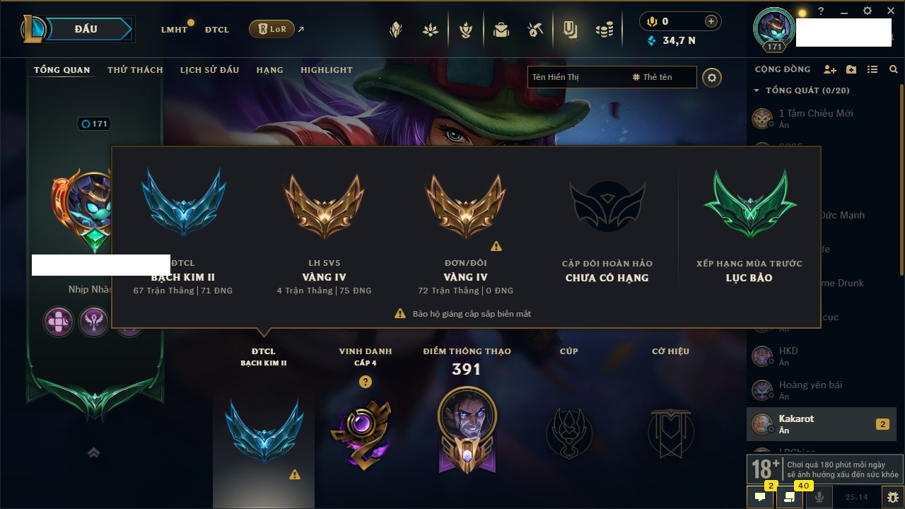 Rank Đơn: Vàng IKhung: Bạch kimTướng: 170 - Còn 212450 THXTrang Phục: 214Rank ĐTCL: Bạch Kim IVLinh Thú: 221