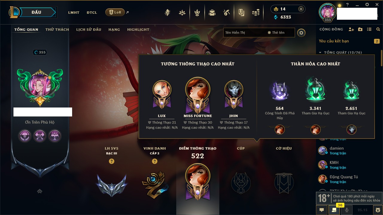 Rank Đơn: Đồng IIIKhung: ĐồngTướng: 170 - Còn 48082 THXTrang Phục: 272Rank ĐTCL: Chưa RankLinh Thú: 84