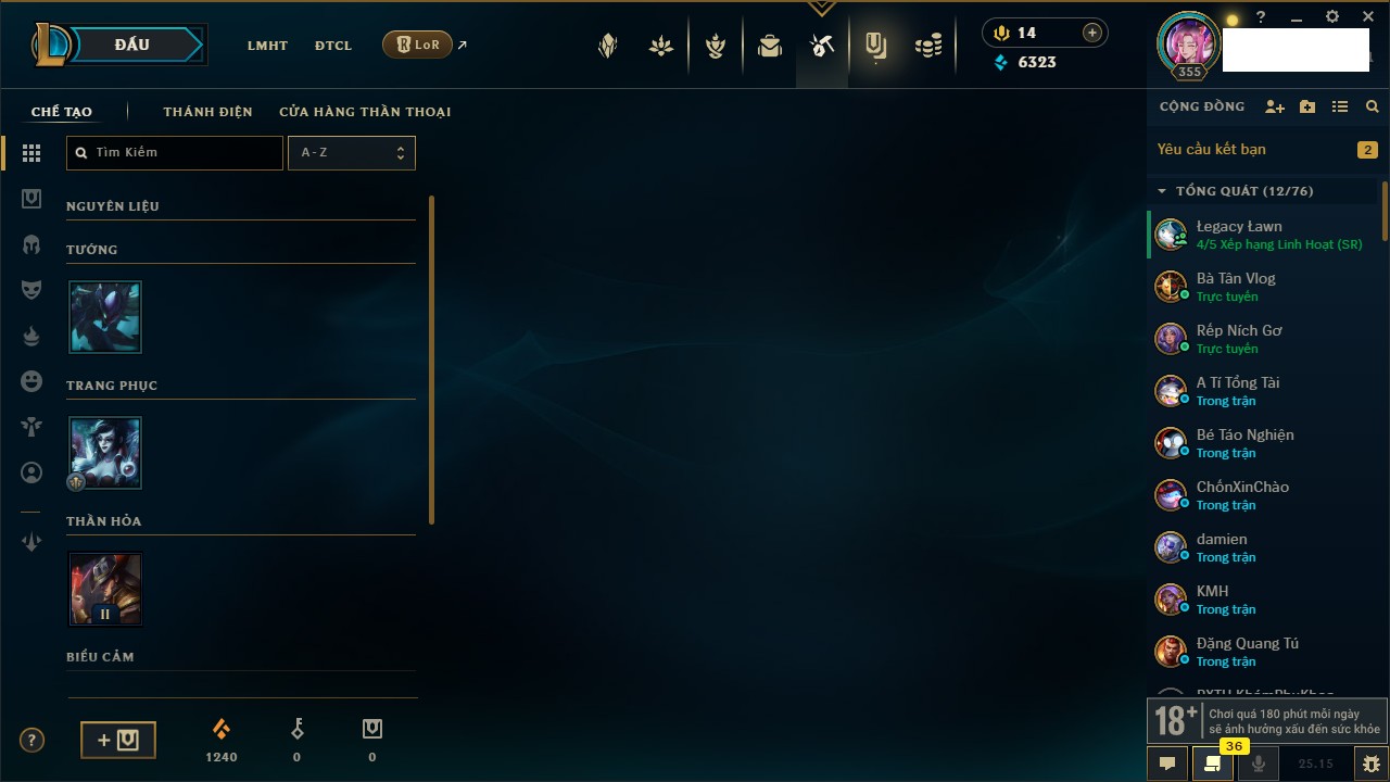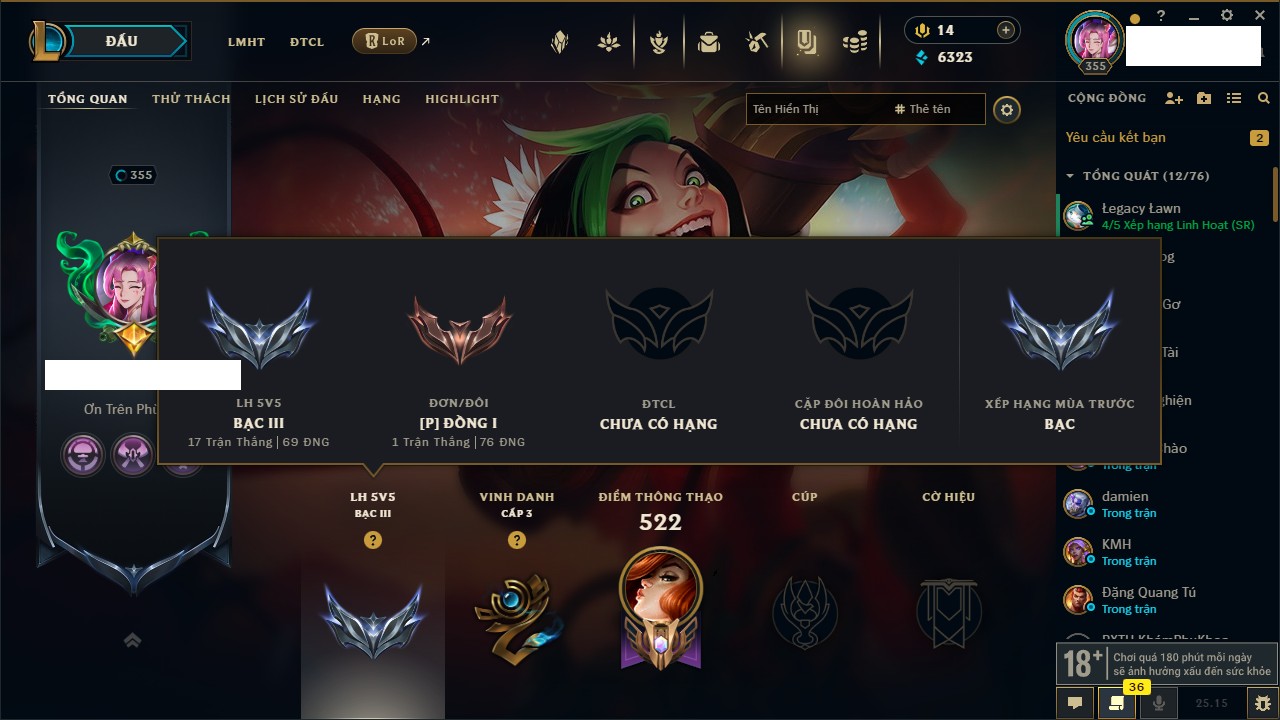 Rank Đơn: Bạch Kim IIKhung: Bạch kimTướng: 171 - Còn 263986 THXTrang Phục: 306Rank ĐTCL: Lục Bảo IVLinh Thú: 96