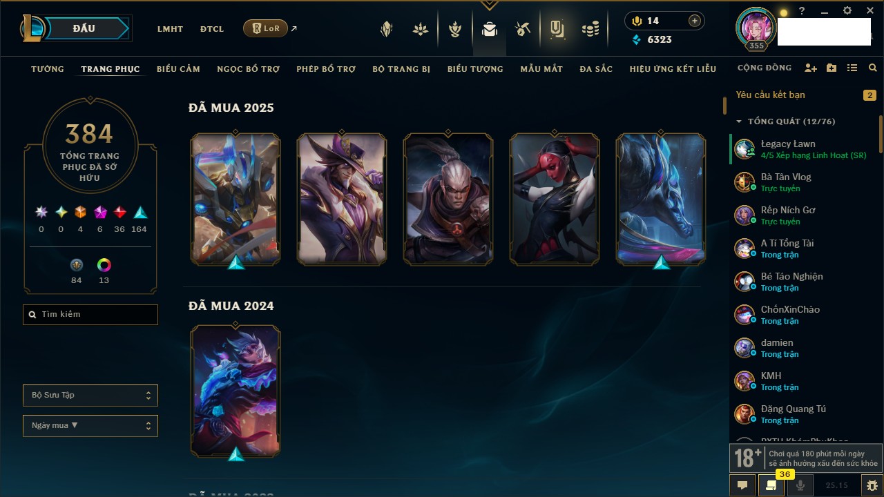 Rank Đơn: Bạch Kim IIIKhung: Bạch kimTướng: 170 - Còn 61079 THXTrang Phục: 352Rank ĐTCL: Sắt IILinh Thú: 70