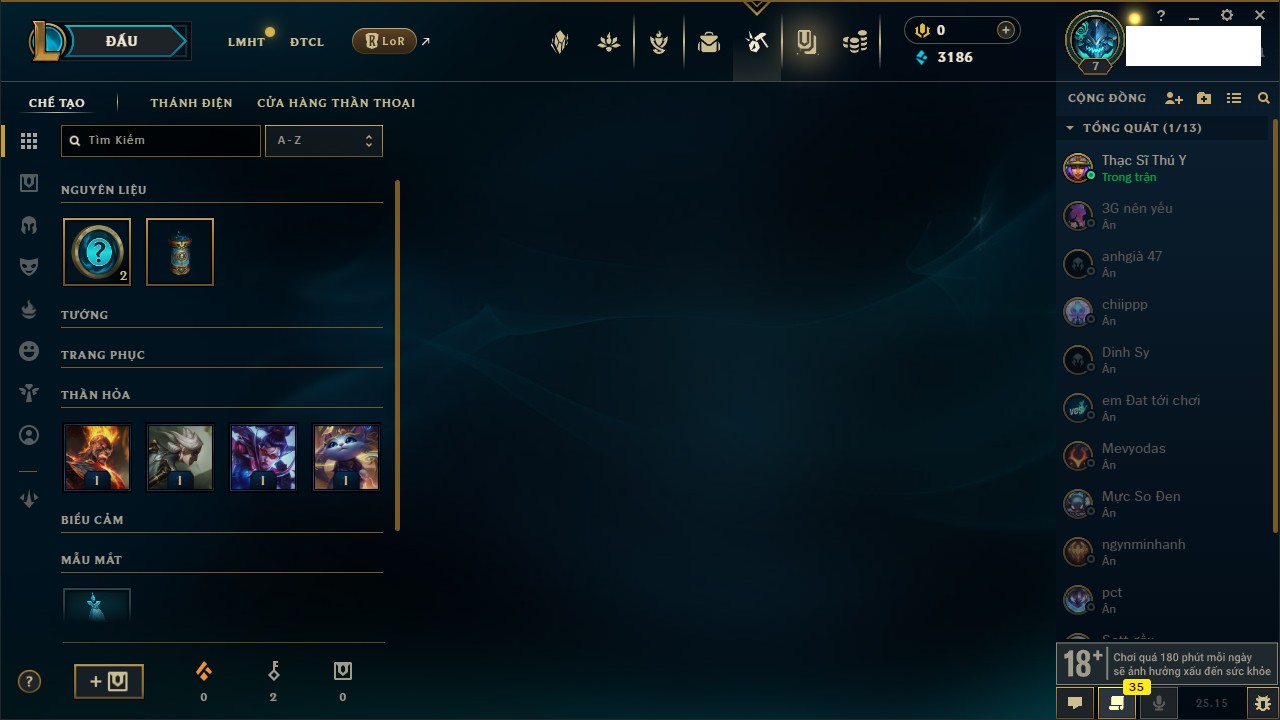 Rank Đơn: Bạch Kim IIKhung: Bạch kimTướng: 171 - Còn 263986 THXTrang Phục: 306Rank ĐTCL: Lục Bảo IVLinh Thú: 96