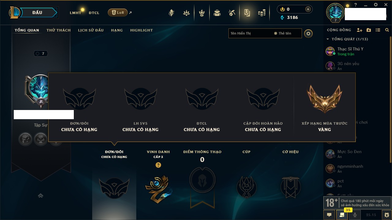 Rank Đơn: Vàng IKhung: Bạch kimTướng: 170 - Còn 212450 THXTrang Phục: 214Rank ĐTCL: Bạch Kim IVLinh Thú: 221