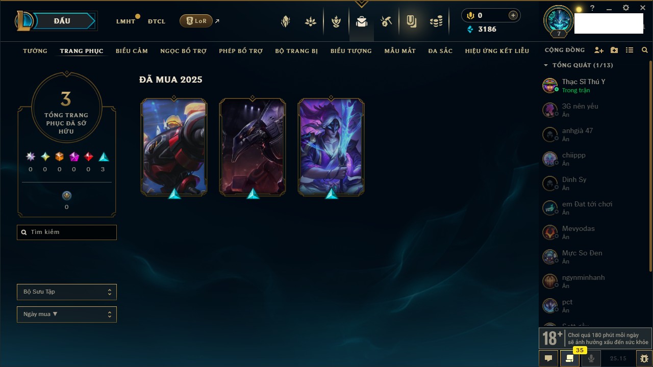 Rank Đơn: Đồng IIIKhung: ĐồngTướng: 170 - Còn 48082 THXTrang Phục: 272Rank ĐTCL: Chưa RankLinh Thú: 84