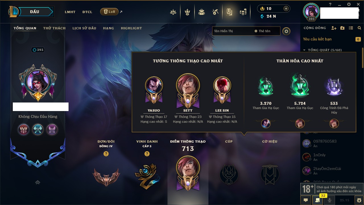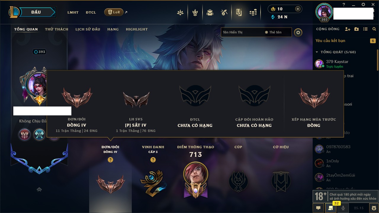 Rank Đơn: Đồng IIKhung: ĐồngTướng: 170 - Còn 66145 THXTrang Phục: 215Rank ĐTCL: Chưa RankLinh Thú: 52