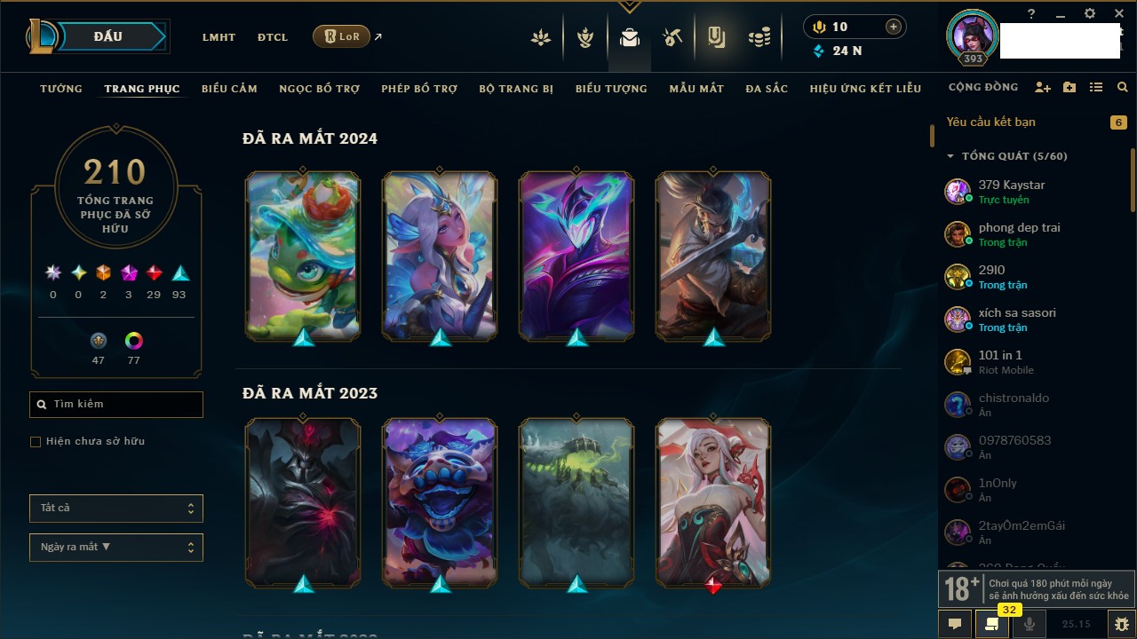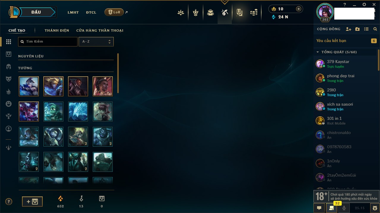 Rank Đơn: Vàng IIIKhung: BạcTướng: 171 - Còn 101359 THXTrang Phục: 88Rank ĐTCL: Kim Cương IVLinh Thú: 200