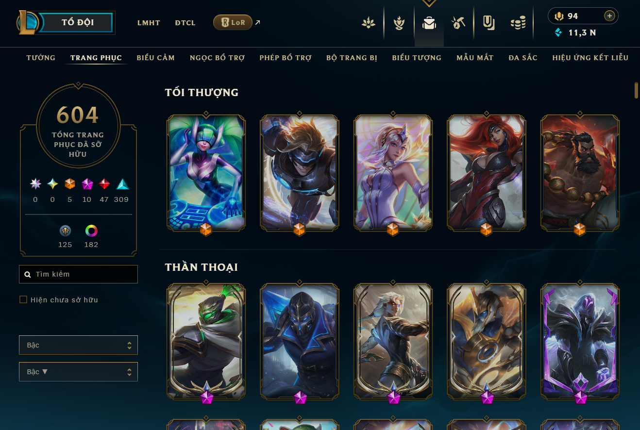 Rank Đơn: Chưa Rank Khung: Chưa có khung Tướng: 104 - Còn 10052 THX Trang Phục: 52 Rank ĐTCL: Chưa Rank Linh Thú: 155