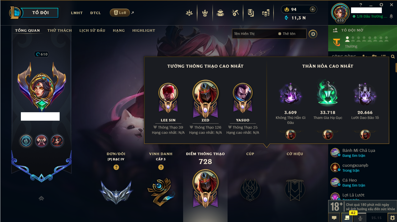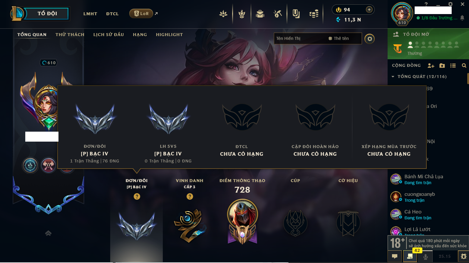 Rank Đơn: Bạc IV Khung: Vàng Tướng: 172 - Còn 11123 THX Trang Phục: 288 Rank ĐTCL: Vàng IV Linh Thú: 117