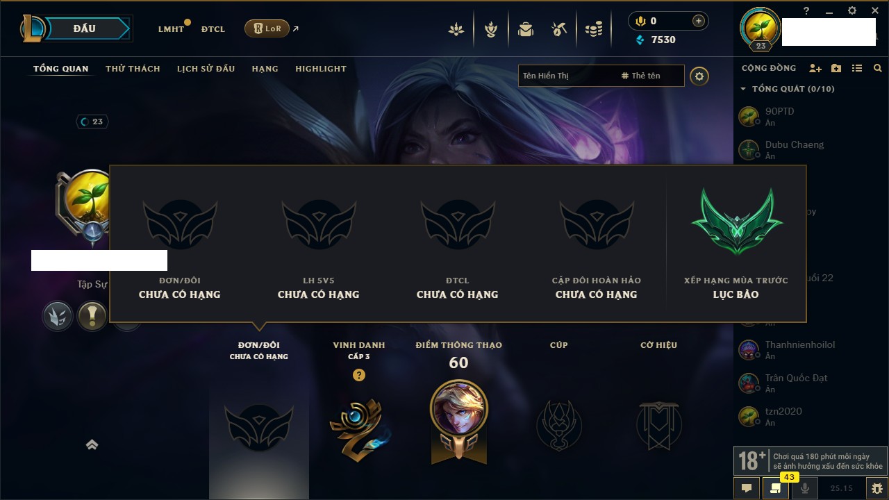 Rank Đơn: Lục Bảo IVKhung: VàngTướng: 171 - Còn 154648 THXTrang Phục: 203Rank ĐTCL: Bạch Kim IVLinh Thú: 69
