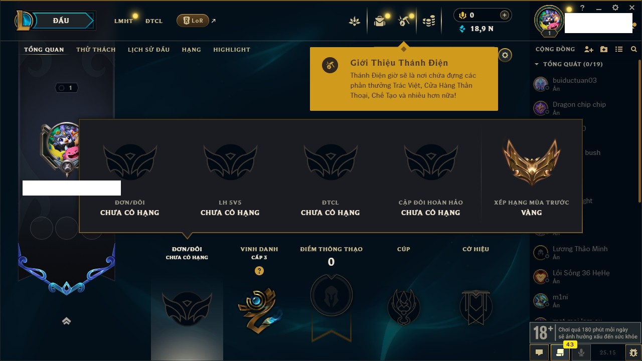 Rank Đơn: Bạc IIKhung: Bạch kimTướng: 169 - Còn 81813 THXTrang Phục: 301Rank ĐTCL: Chưa RankLinh Thú: 140