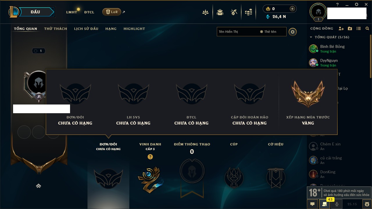 Rank Đơn: Vàng IKhung: Bạch kimTướng: 170 - Còn 212450 THXTrang Phục: 214Rank ĐTCL: Bạch Kim IVLinh Thú: 221