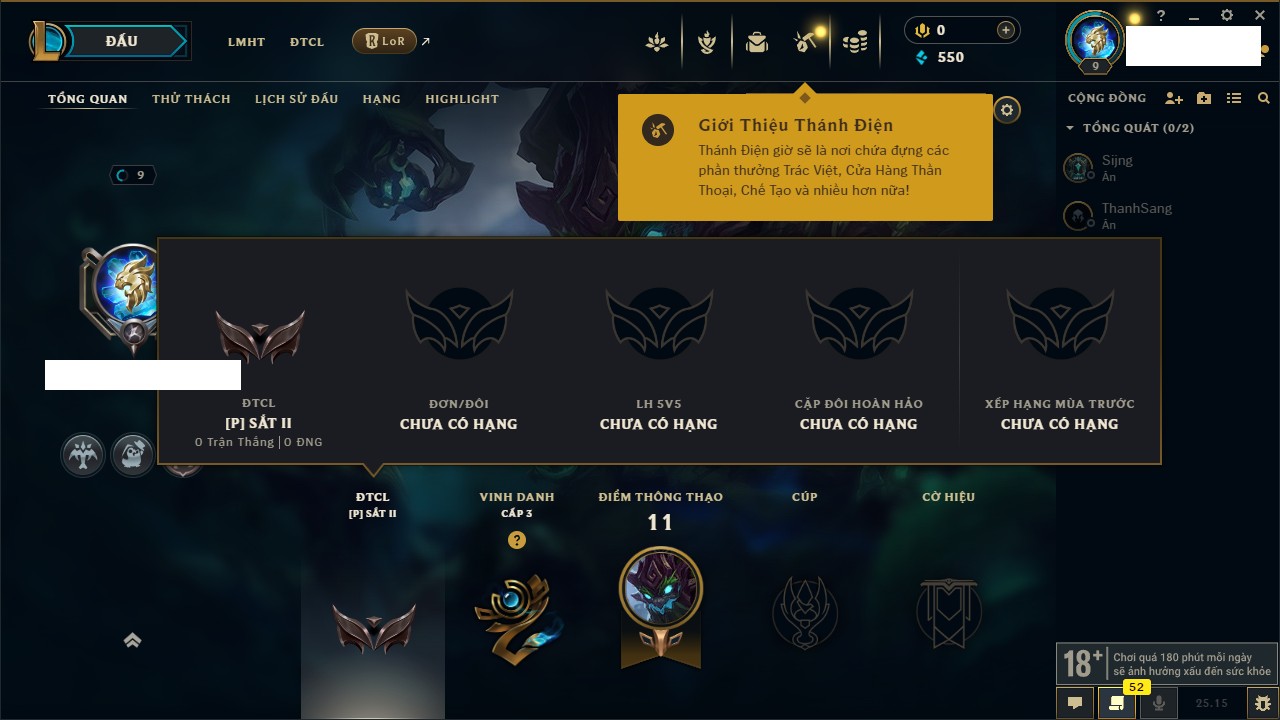 Rank Đơn: Vàng IKhung: Bạch kimTướng: 170 - Còn 212450 THXTrang Phục: 214Rank ĐTCL: Bạch Kim IVLinh Thú: 221