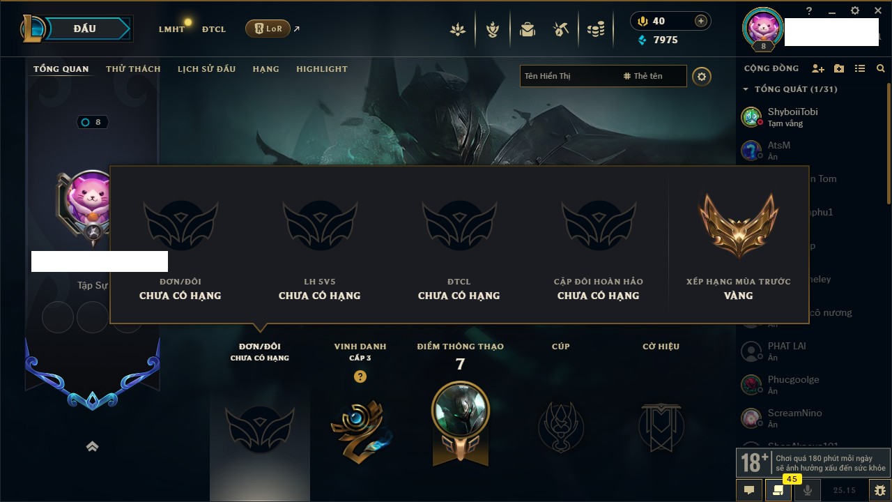 Rank Đơn: Vàng IKhung: Bạch kimTướng: 170 - Còn 212450 THXTrang Phục: 214Rank ĐTCL: Bạch Kim IVLinh Thú: 221