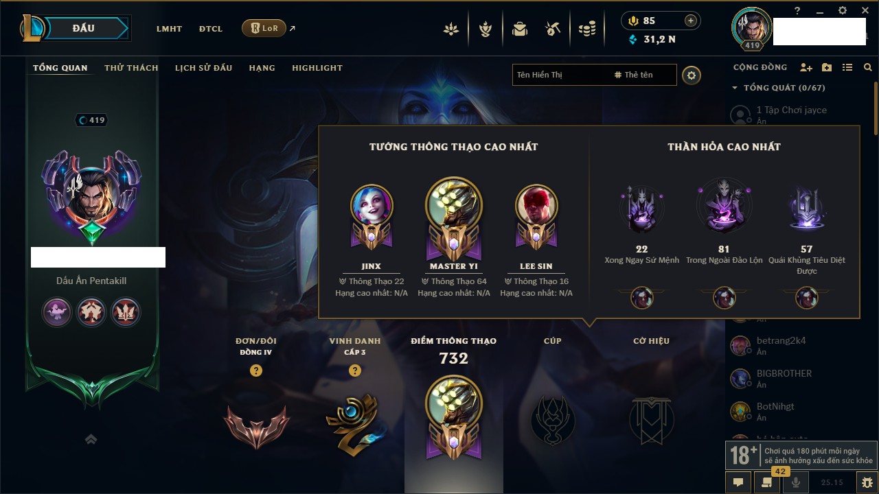 Rank Đơn: Bạch Kim IIKhung: Bạch kimTướng: 171 - Còn 316137 THXTrang Phục: 89Rank ĐTCL: Bạch Kim IIILinh Thú: 94