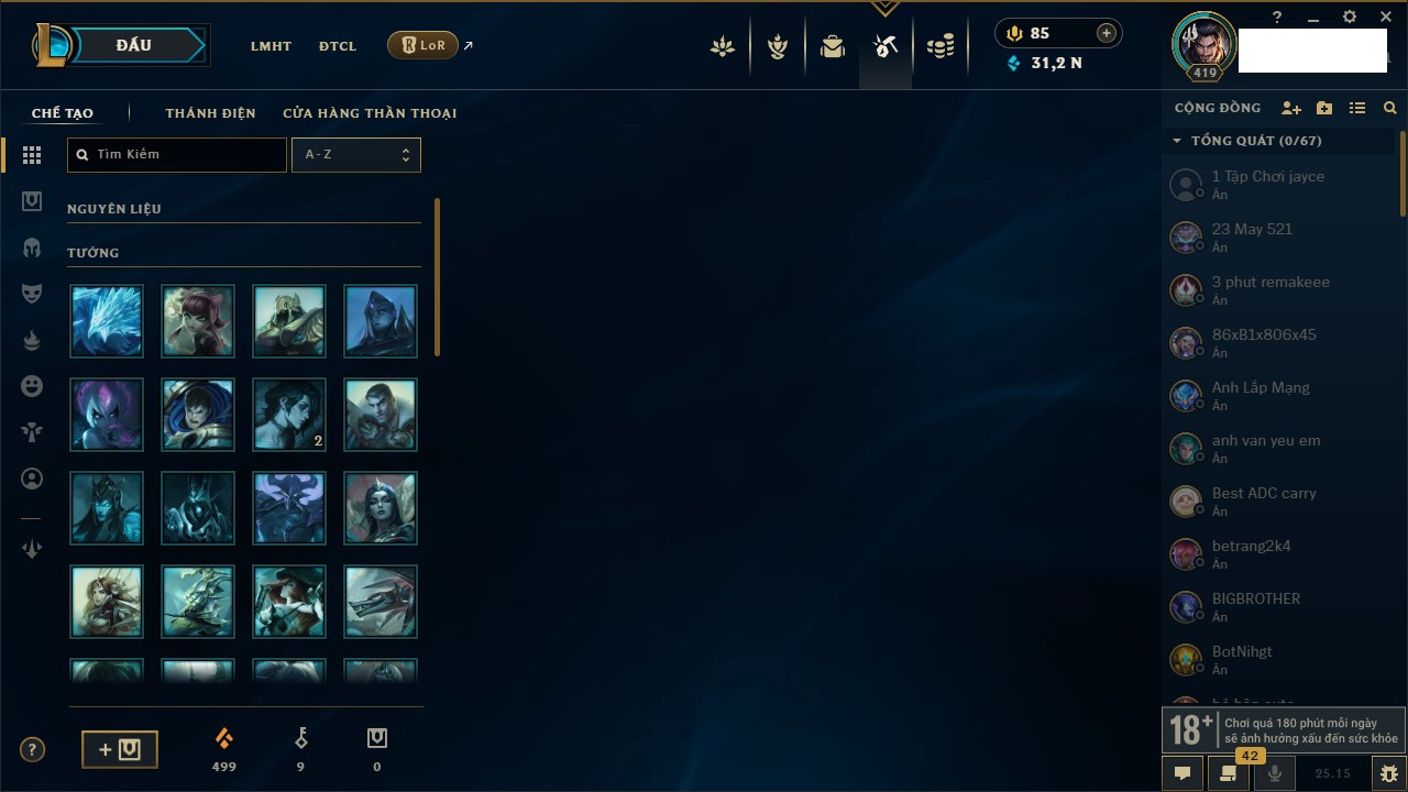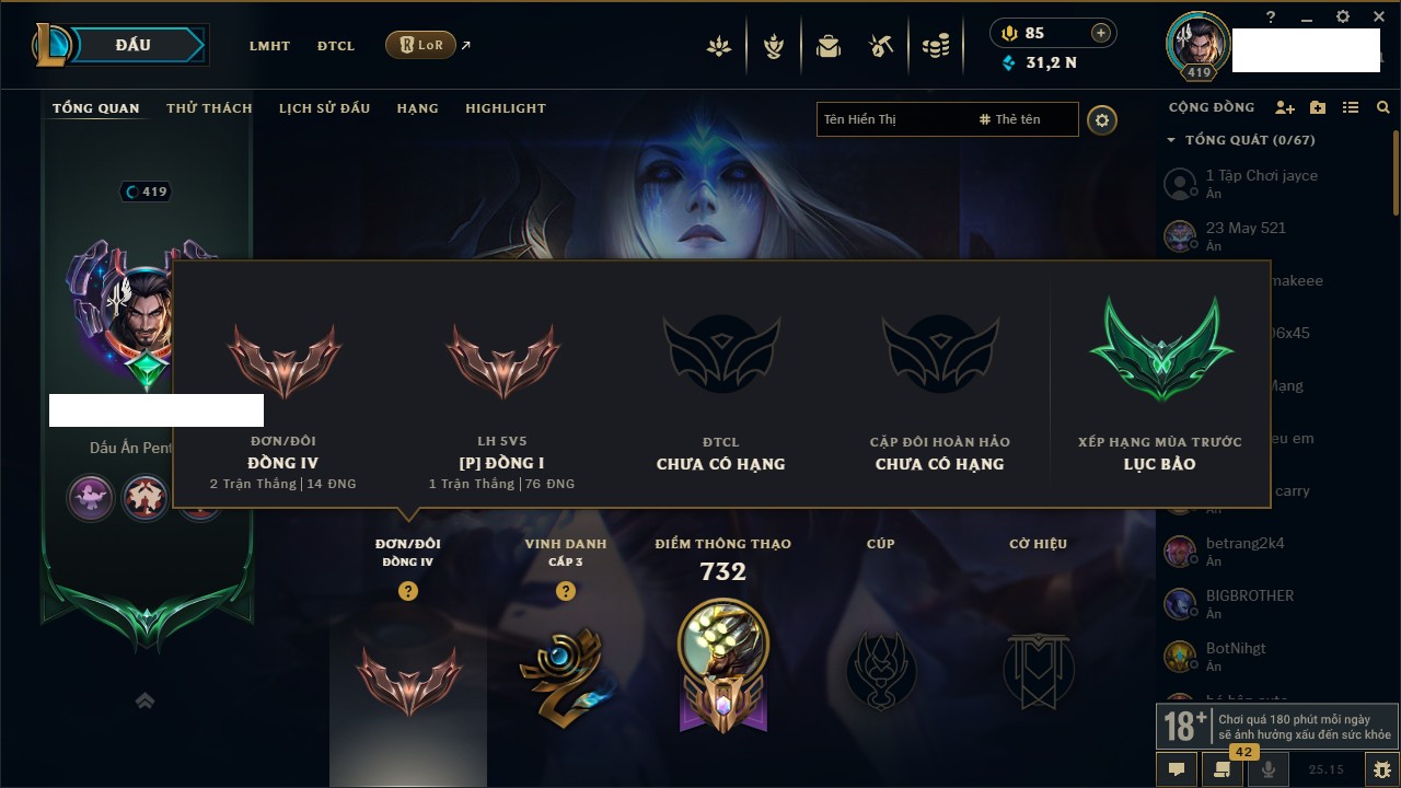 Rank Đơn: Lục Bảo IVKhung: VàngTướng: 171 - Còn 154648 THXTrang Phục: 203Rank ĐTCL: Bạch Kim IVLinh Thú: 69