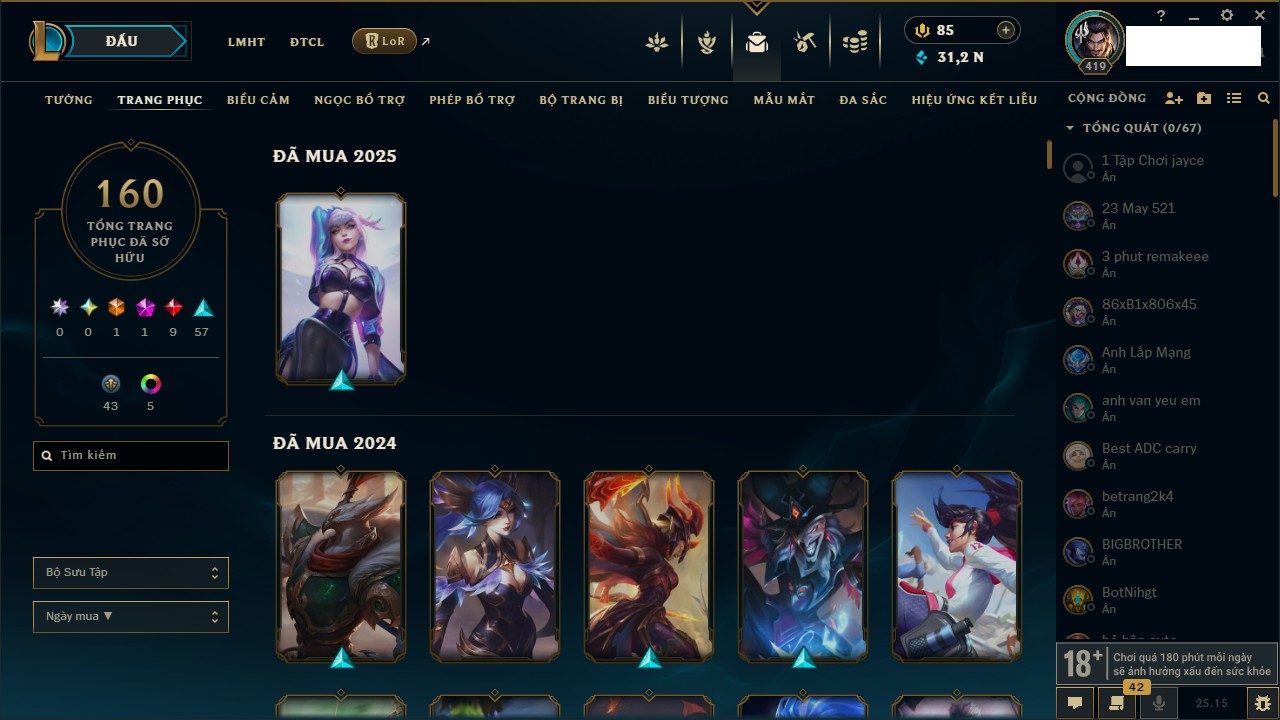 Rank Đơn: Vàng IIKhung: VàngTướng: 170 - Còn 243330 THXTrang Phục: 230Rank ĐTCL: Chưa RankLinh Thú: 68