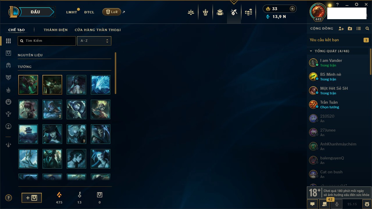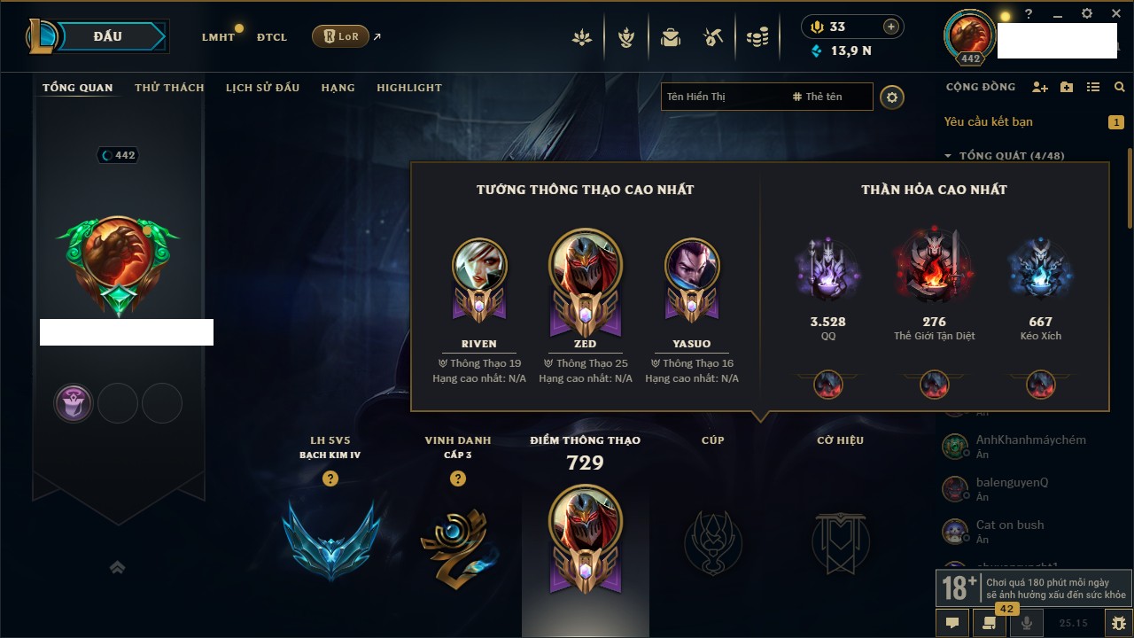 Rank Đơn: Bạch Kim IVKhung: Bạch kimTướng: 171 - Còn 182788 THXTrang Phục: 158Rank ĐTCL: Lục Bảo IVLinh Thú: 56