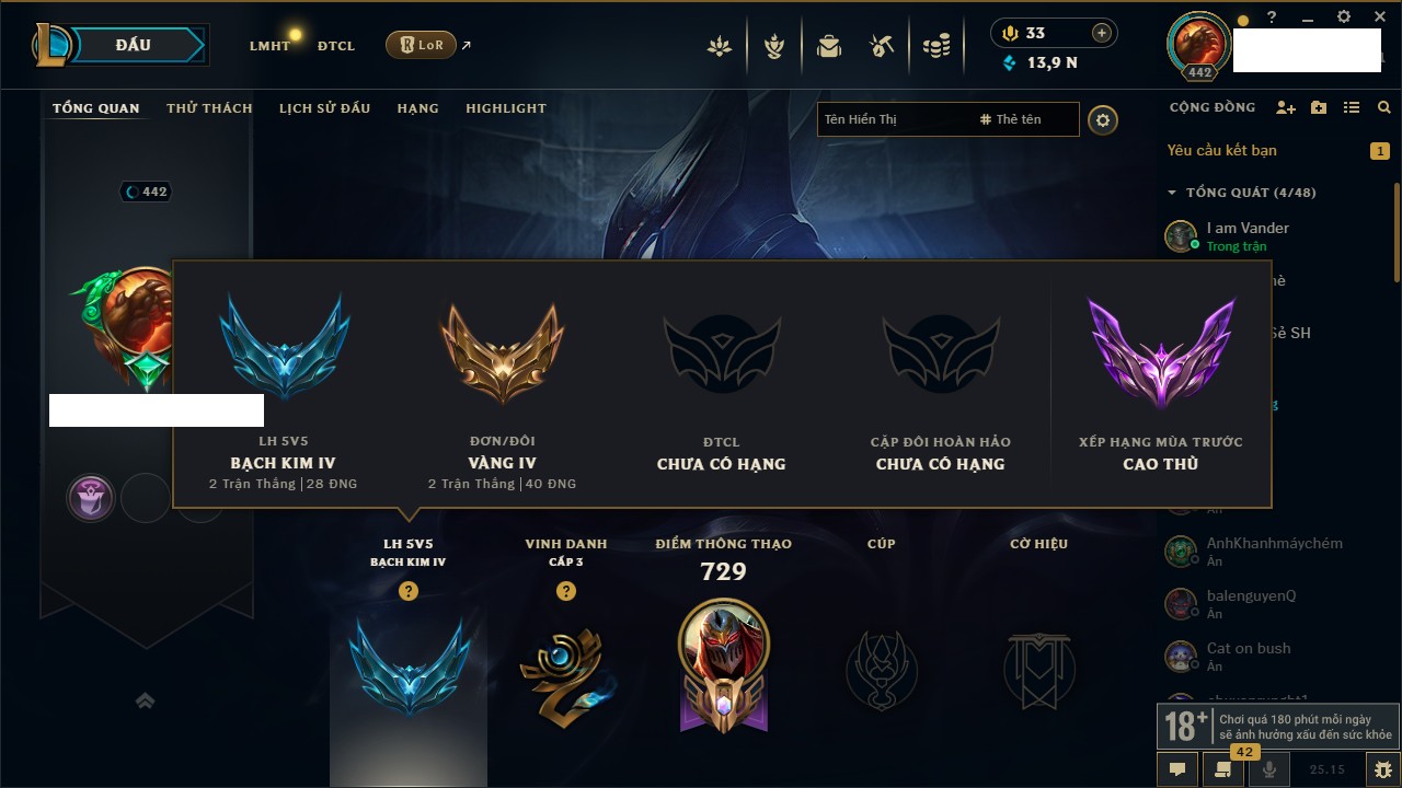 Rank Đơn: Vàng IKhung: Bạch kimTướng: 170 - Còn 212450 THXTrang Phục: 214Rank ĐTCL: Bạch Kim IVLinh Thú: 221