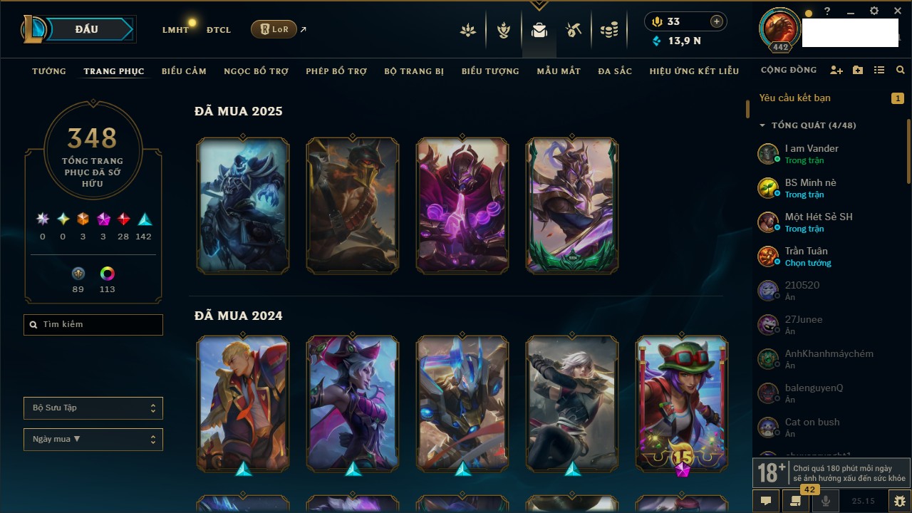 Rank Đơn: Đồng IIIKhung: ĐồngTướng: 170 - Còn 48082 THXTrang Phục: 272Rank ĐTCL: Chưa RankLinh Thú: 84